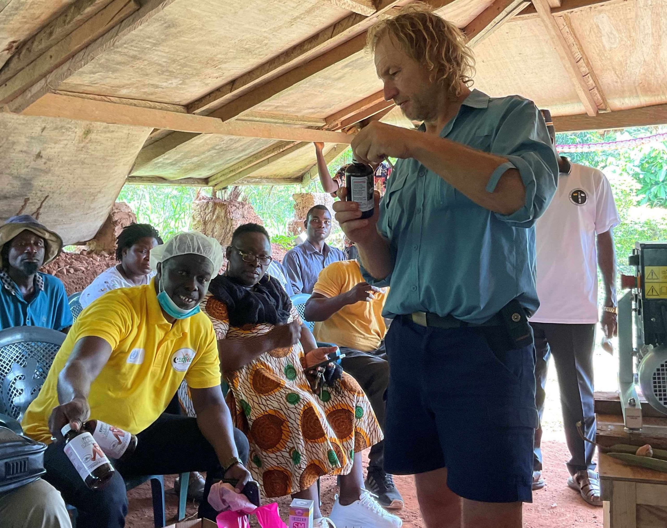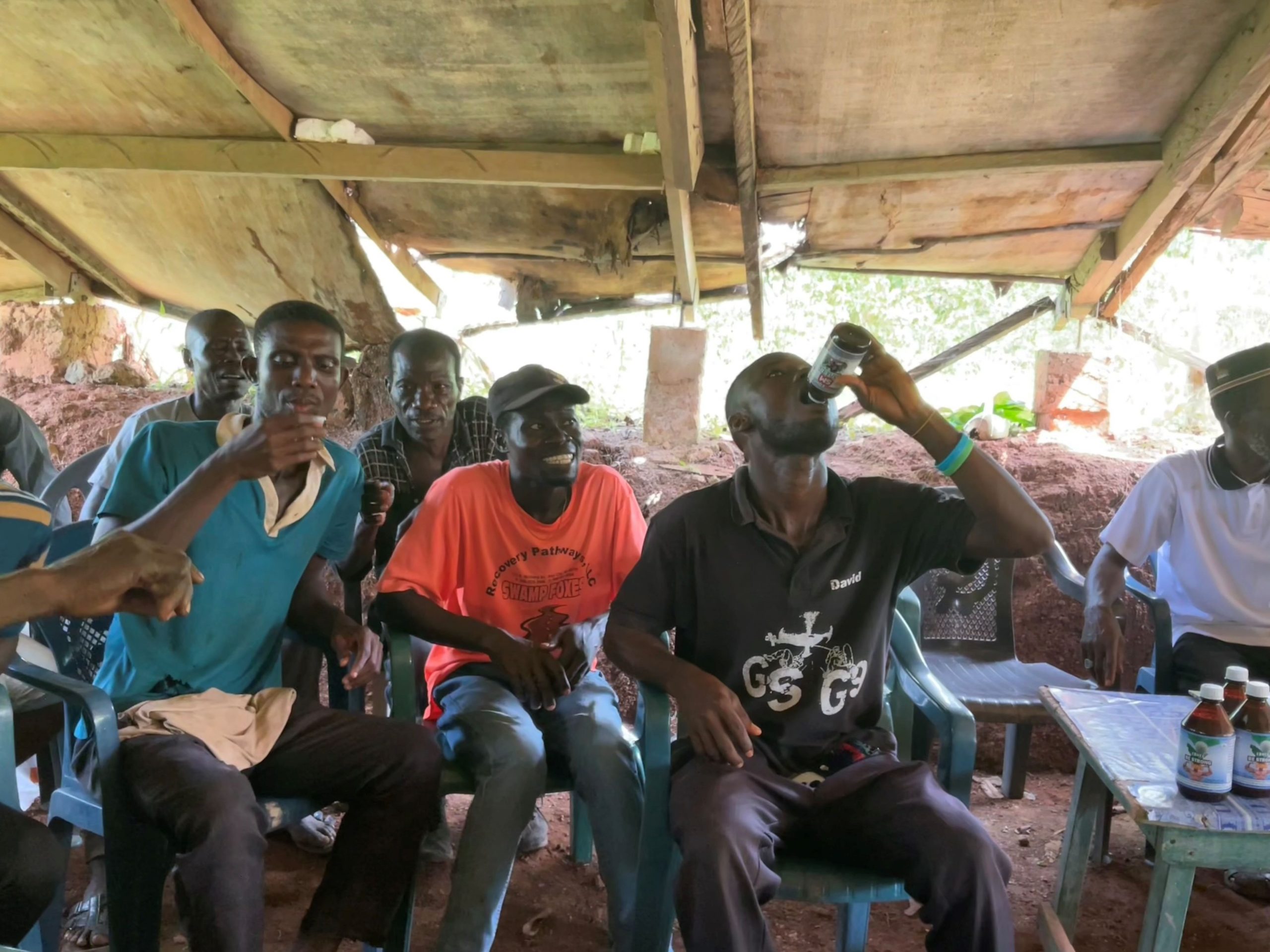 The destillation of alcohol from palms. First introduction to the small scale factory at our demo site of our farmer John.